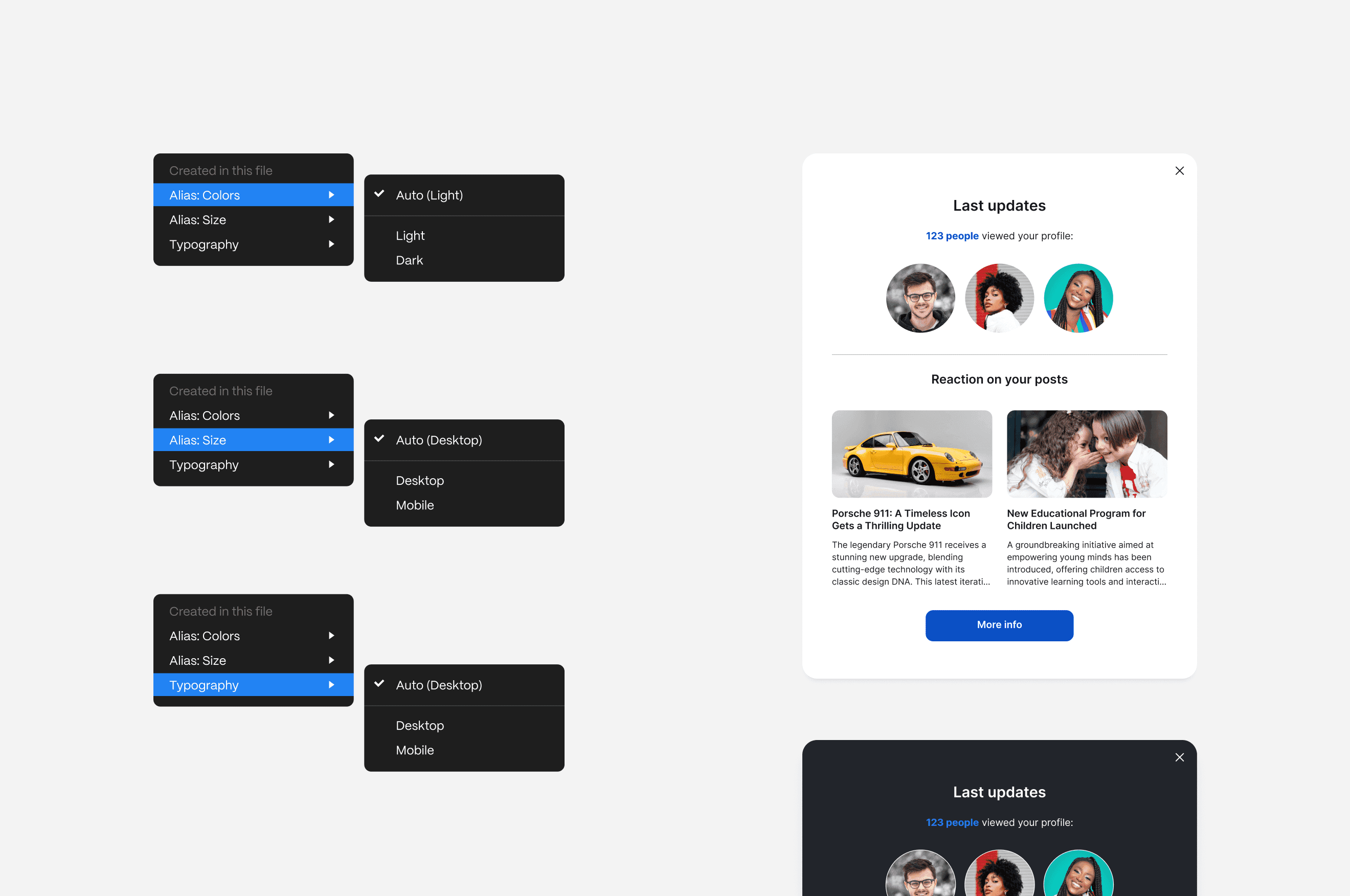 Total customization of components. Dark or light mode, branding and adaptation to the device. All based on variable. Fast, convenient, in accordance with modern industry standards.